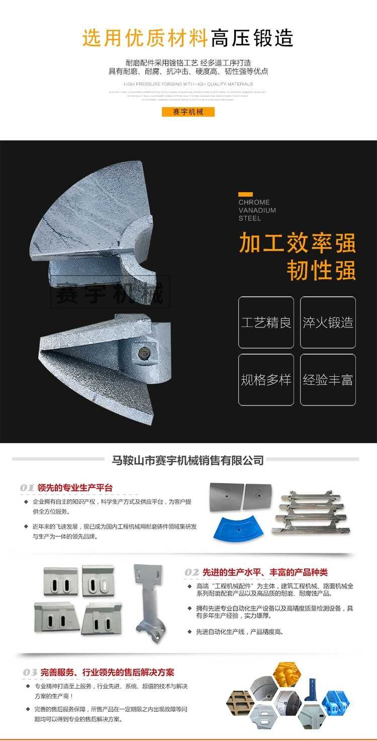 馬鞍山市賽宇機(jī)械銷售有限公司主要產(chǎn)品有:混凝土攪拌站攪拌主機(jī)配件、瀝青拌合站攪拌機(jī)配件、穩(wěn)定土拌合站配件、攤鋪機(jī)配件、路拌機(jī)配件、銑刨機(jī)刀頭、平地機(jī),攪拌臂、襯板、攪拌葉片、刀片、中攪拌臂左右攪拌臂、側(cè)攪拌臂、攪拌葉片、葉片、中刮刀、左攪拌葉片、右側(cè)刮刀、襯板、菱形襯板、方形襯板、梯形襯板、側(cè)襯板、端襯板、異形襯板、口襯板、槽體襯板、軸頭密封配件、瀝青攪拌站槳葉、槳臂襯板、除塵布袋、穩(wěn)定土攤鋪機(jī)螺旋葉片、履帶板、熨平板、輸料板、平地機(jī)刀片、刀角、路拌、銑刨機(jī)合金刀頭、刀庫(kù)、高強(qiáng)度螺栓、耐磨配件特高鎳鉻合金、多元素合金和高鉻合金。激光切割機(jī),數(shù)控刨槽機(jī),壓力機(jī),卷板機(jī),折彎?rùn)C(jī)、折彎?rùn)C(jī)模具、剪板機(jī)、剪板機(jī)刀片、數(shù)控折彎?rùn)C(jī)模具、NCT模具、數(shù)控沖模、、橡膠機(jī)械刀片,三菱切腳機(jī)刀片、高精度圓刀片、鎢鋼刀片各種機(jī)械標(biāo)準(zhǔn)及非標(biāo)模具,鋼鐵工業(yè)刀片、紙制品工業(yè)刀片、信息產(chǎn)業(yè)刀片、紙工業(yè)刀片,塑料行業(yè)刀片,冶金行業(yè)刀片,藥材粉碎切片刀片,電子行業(yè)刀片,包裝行業(yè)刀片,紡織行業(yè)刀片等。為板材加工,鈑金加工,鋼廠,造紙廠,塑料廠,線路板.銅箔制造廠,印刷廠,包裝廠,紡織織布廠及各個(gè)行業(yè)機(jī)床使用。主要客戶為:航天航空,汽車輪船,金屬加工,混凝土攪拌站、瀝青攪拌站、路面機(jī)械租憑公司、路橋公司、中國(guó)水利建設(shè)單位、中鐵公司、中國(guó)水利局施工局公司、機(jī)械廠、電器廠、電子廠、軋鋼廠、紙制品公司全鋼子午線輪胎公司橡膠輪胎廠。
