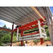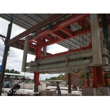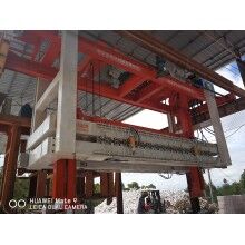 移動式掰板機(jī)工作流程:蒸養(yǎng)完成的成品連同模具側(cè)板被模具側(cè)板運(yùn)輸裝置送至移動掰板機(jī)下,頂升裝置啟動,將坯體連同側(cè)板頂起,移動掰板機(jī)從上層至下層依次掰開,掰至底層后,移動掰板機(jī)將全部成品夾起,并移至砌塊成品打包線上,將砌塊放置在該打包線上,移動掰板機(jī)繼續(xù)將加氣板移動至加氣板輸送打包線上,重新返回。掰扳機(jī)專門負(fù)責(zé)坯體切開之后(經(jīng)蒸養(yǎng))又重新粘連在一起,在自動打包之前將其一塊一塊分離,消除由于粘連造成的廢、次品,同時(shí)保證打包線正常運(yùn)行。