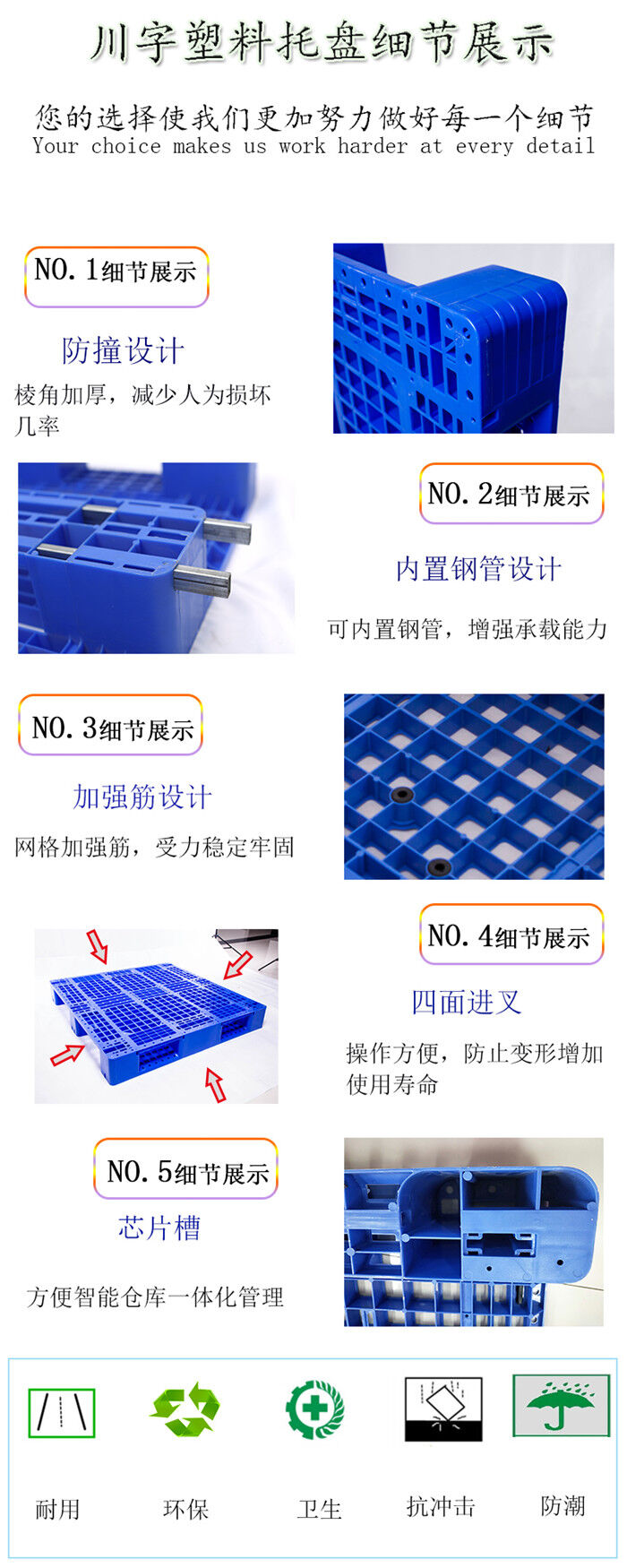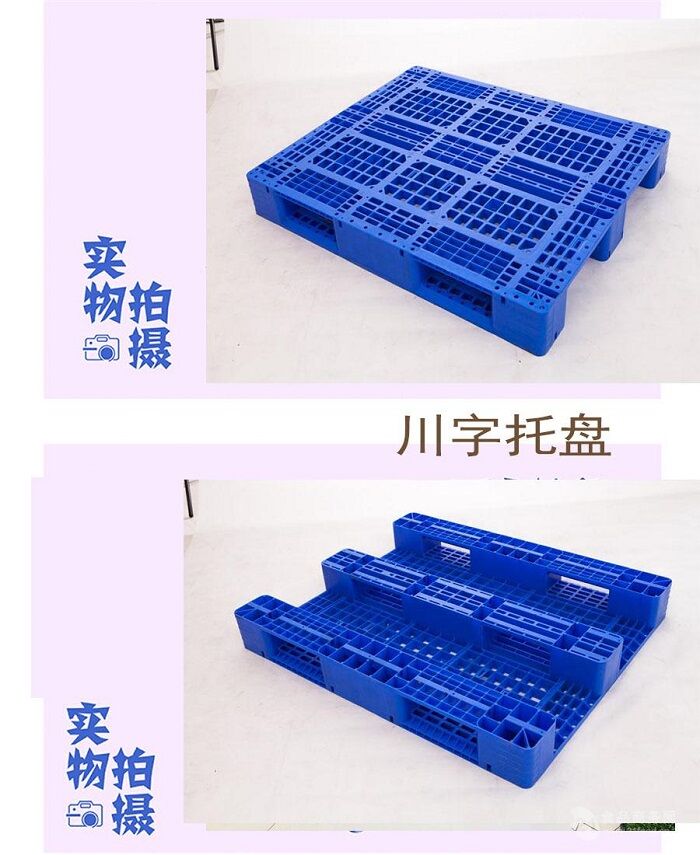 1210川字塑料托盤(加八根鋼管) 尺寸:1200×1100×150mm 進叉形式:四向進叉 適合電動叉車 手動液壓車 底部結(jié)構(gòu):單面字型 材質(zhì):抗沖擊HDPE 進口全新料 靜載:4800kg 動載:1600kg