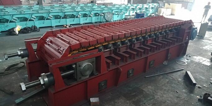 牽引鏈采用配套廠家的履帶鏈,節(jié)距誤差小,強度高,不宜變形,并且在使用期內(nèi)無須潤滑,日常操作維修方便快捷。鏈板底全部采用錳鋼板制作,采用單圓弧搭接結(jié)構(gòu)形式,工作時始終處于相互搭接狀態(tài)??箾_擊,耐磨損,鏈板之間不漏料,安全可靠。每個鏈板兩側(cè)采用導(dǎo)向板定位,通過8個螺栓與履帶鏈牢固連接,保證了鏈板相互之間咬合準確。鏈板底板下面焊有加強筋板,鏈板運行時有四列滾輪支撐,可保證承受大的物料沖擊而不變形。整機現(xiàn)場的粉塵、噪音狀況大為改善,工人操作環(huán)境得到了明顯改進。