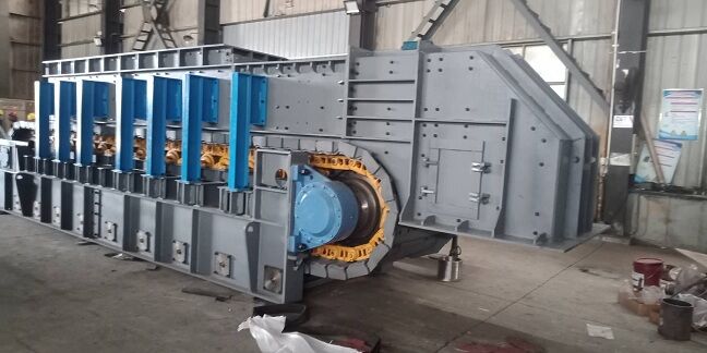 方式一:板式給料機(jī)上料。建筑廢棄物由收運(yùn)車(chē)運(yùn)送至原料倉(cāng)庫(kù)內(nèi),傾卸至位于地坑內(nèi)的板式給料機(jī)料倉(cāng)內(nèi),料倉(cāng)寬度在1.5m,方便大尺寸物料(如樓板和混凝土塊)進(jìn)入,通過(guò)板式給料機(jī)輸送至后續(xù)工藝單元。