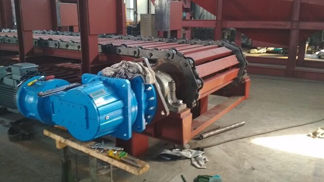 常用齒輥式破碎機的型號有三種,分別為2NPG1010.2NPG1212和2NPG1414,那么與之相配套的新型板式喂料機為GBP1000×L, GBP1200×L, GBP1400×L. 其中L為新型板式給料機頭尾輪中心距,由現(xiàn)場安裝場地大小確定。電機減速機的選型由產(chǎn)量確定。