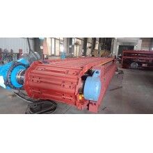 座部件由機(jī)架和支承件組成。機(jī)架由鋼材焊接而成,支承部件有支重輪、下托輪和縱向?qū)к?,輸送板得到支重輪和縱向?qū)к壍碾p重支持,使支重更均勻合理。牽引鏈基本上不受礦石和自重產(chǎn)生的張力作用,支重輪外側(cè)設(shè)計(jì)有凸臺(tái),與主、從動(dòng)輪聯(lián)合作用,成功地杜絕鏈軌跑偏。在機(jī)架下方設(shè)有下托輪,為方便維修,下托輪為側(cè)裝式。