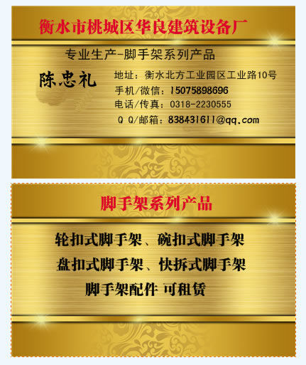 河北衡水華良建筑設備廠是集生產(chǎn)、銷售、租賃于一休的專業(yè)腳手架生產(chǎn)廠家,聯(lián)系電話 :150-7589-8696