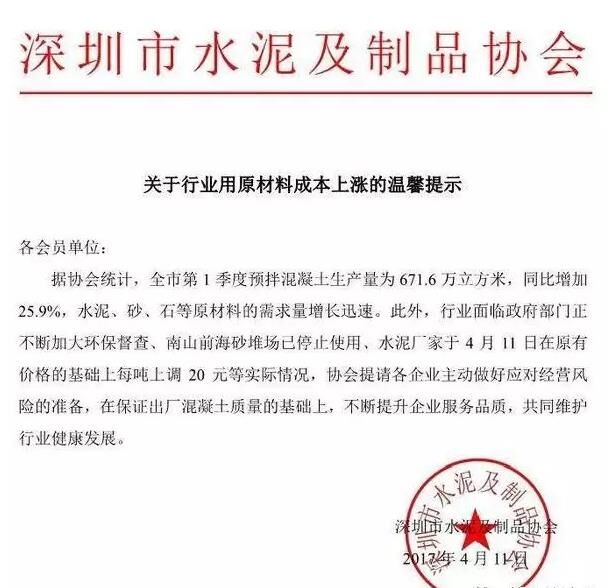 11日,深圳市水泥及制品協(xié)會發(fā)布關于行業(yè)用原材料成本上漲的提示,全市一季度預拌混凝土生產量為671.6萬立方米,同比增加25.9%,水泥、砂、石等原材料的需求量增長迅速。此外,行業(yè)面臨政府部門正不斷加大環(huán)保督查、南山前海砂堆場已停止使用、水泥廠家于4月11日在原有價格的基礎上每噸上調20元。